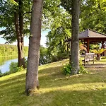 湖の景色を見渡す広々とした寝室1室のRuhe Oase Steinhoefel - Balkon, Naturblick, Design-Maisonette-Apartment - Nahe Fuerstenwalde-Spree Steinhofelは,SteinhofelのVillage church Trebusから2.9キロメ-トルです. お客様の快適な滞在のために,Wi-Fiと無料の専用駐車場を用意しています.